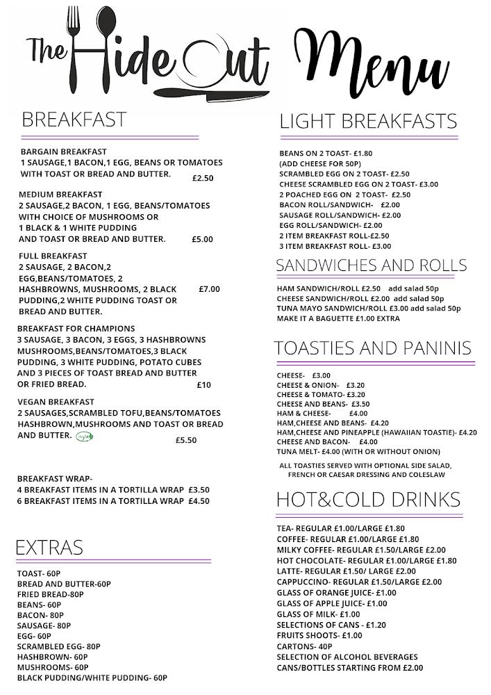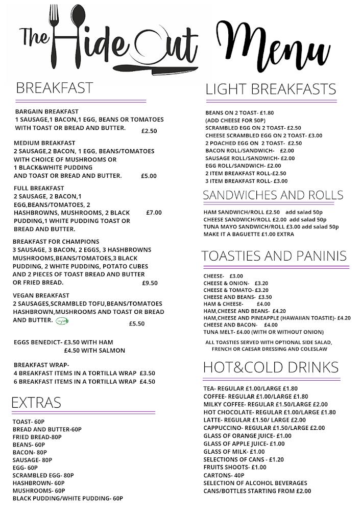 The Hideout occupies a quaint spot in Merthyr Tydfil at UNIT 2, Three Salmon St, CF47 8DS. What sets this local café apart is its balance of a casual setting with a dash of hospitality that makes every customer feel valued. The location is easily accessible, boasting features like wheelchair-friendly seating and an entrance, making it a welcoming spot for all. Hours of operation ensure it meets the needs of different diners—open every day of the week, it caters to breakfast seekers and lunch lovers alike. Popular among both locals and tourists, this café serves as a go-to space for solo diners and groups wanting to enjoy a meal together. Additionally, with takeout and delivery options, it presents various ways to experience its wonderful menu without any fuss.